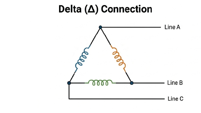 In a delta connection, three windings are joined end-to-end in a closed loop that looks like a triangle. There is no central neutral point in this setup.