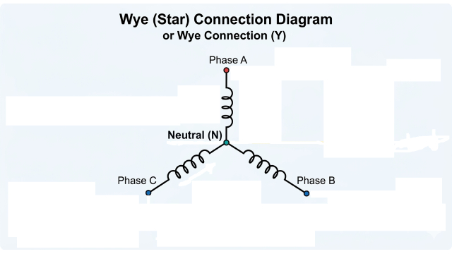 The wye connection, also called a star connection, joins one end of each of the three windings to a shared central neutral point. It looks like the letter “Y.”