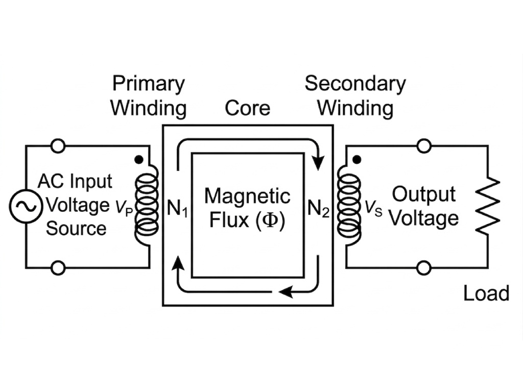 Below is a simple breakdown of a basic single-phase transformer electrical diagram. Picture two coils of wire with a block in the middle. On the left, you have the Primary Winding, which connects to your Input Voltage source. On the right is the Secondary Winding, which delivers the transformed Output Voltage to your load. The block in the middle represents the Core, which moves magnetic energy between the windings.