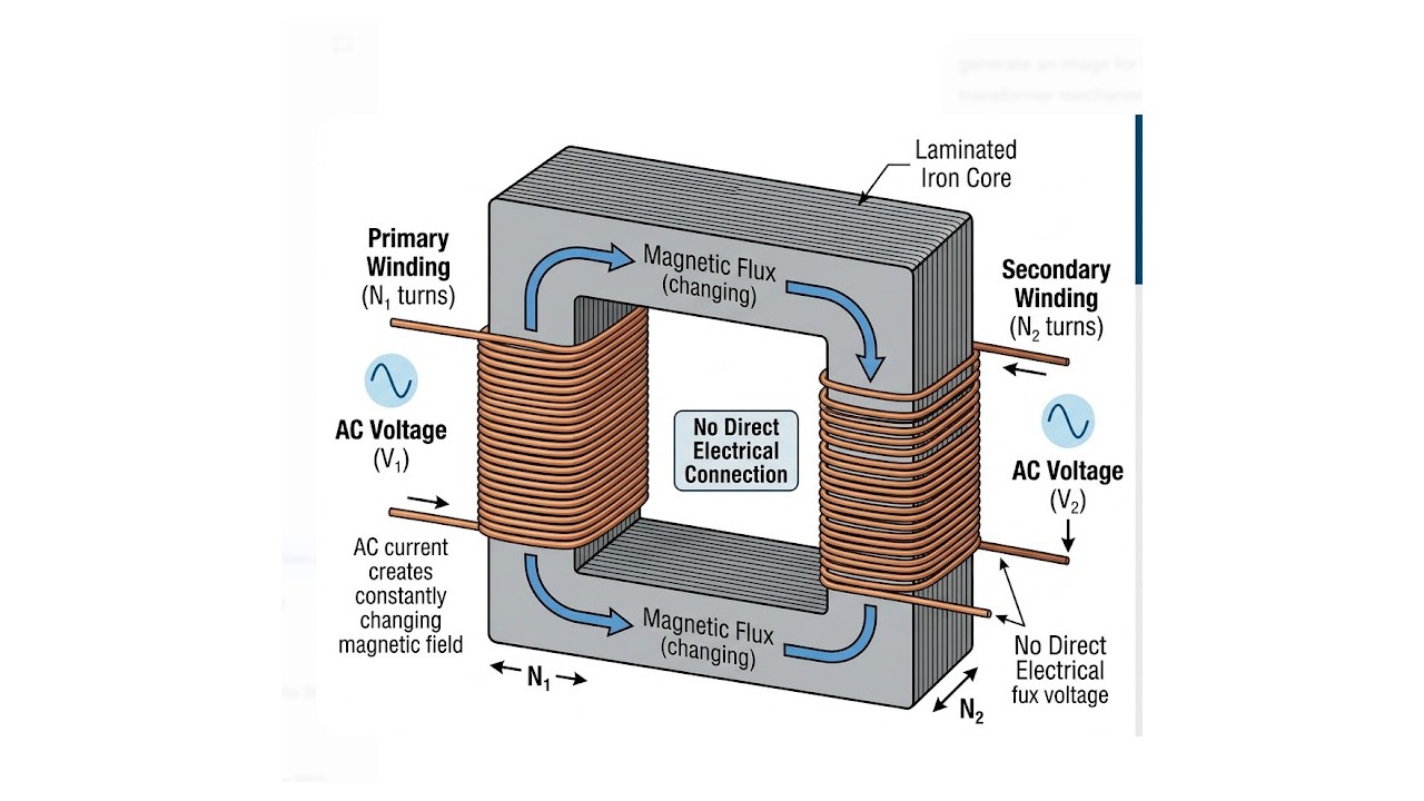 Every transformer runs on one key law of physics: Faraday’s Law of Electromagnetic Induction. This law says that a changing magnetic field will create a voltage in a nearby wire. Transformers use this idea to move energy from one circuit to another with very little waste.